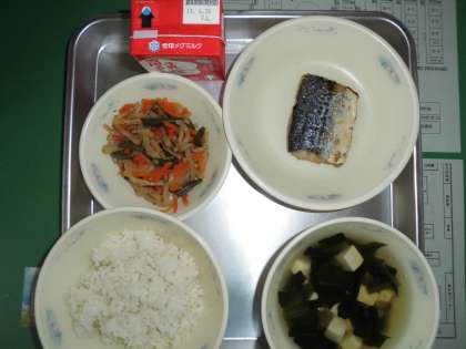 今日の給食は,麦ごはん・すまし汁・野菜のきんぴら・さわらの幽庵焼き・牛乳です。