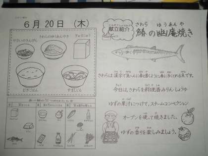 給食カレンダーでは,さわらについて紹介しています。さわらは,魚へんに春と書きます。春に多くとれるさわらをスチームコンベクションオーブンでじっくり焼きました。ゆずの香りが,とてもおいしそうです。