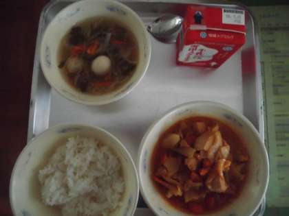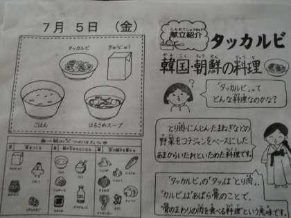 今日の給食は,ごはん・春雨スープ・タッカルビ・牛乳です。