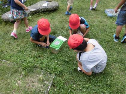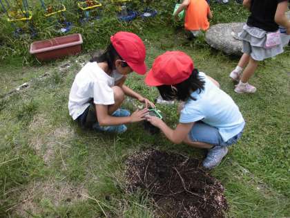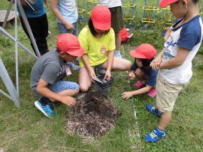 先日栢社遺跡で見つけた虫たちの住みかを快適なものにしようと,飼い方を見ながら中庭にいきました。