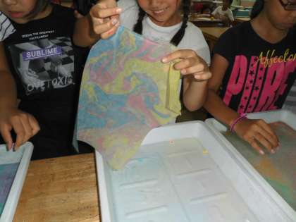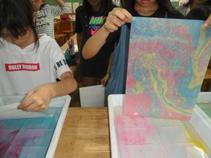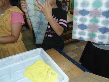 マーブリングと板じめ染めの2種類をしました。次回は,これをうちわに仕上げます。楽しみですね。