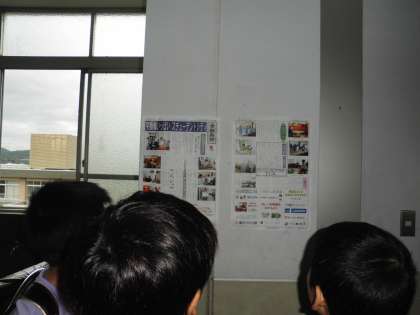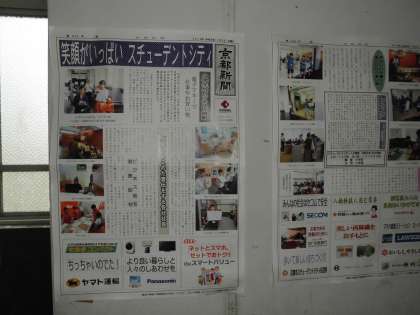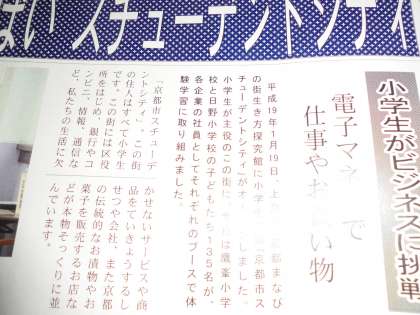 スチューデントシティの新聞のまわりに,5年生の子たちが群がっています。京都新聞の日野版です。