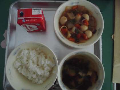 今日の給食は,ごはん・豆腐と青菜のスープ・プリプリ中華炒め・牛乳です。