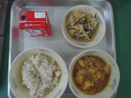 今日の給食は,麦ごはん・肉じゃが(ピリカラ味噌味)・切干し大根の煮つけ・牛乳でした。