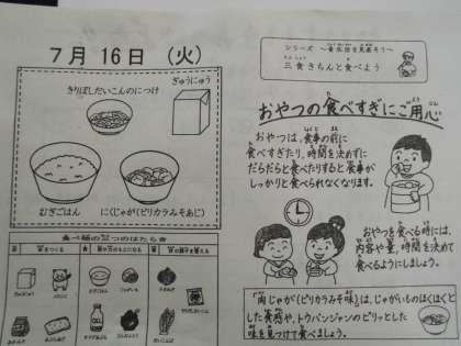 給食カレンダーでは,「おやつの食べ方」について紹介しています。おやつを食べるときには,時間・量・ものに気を付けて食べるようにしてくださいね。