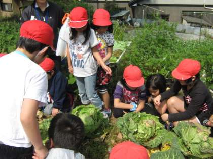 理科の学習では,こん虫を育てていきます。今日は,地域の方にご協力いただいて,畑にモンシロチョウの卵を取りに行きました。キャベツにたくさん卵がついていました。