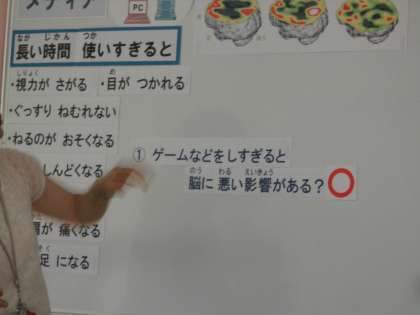今回の保健指導は,メディア(テレビやパソコン,スマホやゲームなど)と身体への影響です。クイズをとおして,それぞれ考えさせられることがたくさんありました。柴原先生のお話を,どの子も真剣に聞いていました。
