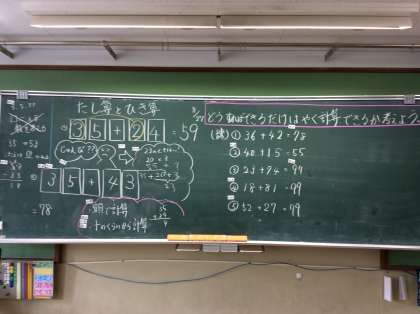 「35+2□という問題をできるだけ早く解こう!」という問題で「準備しておけばいいやん!」と盛り上がりました。暗算とひっ算との計算方法の違いを楽しみながらも,一生懸命考えていました。