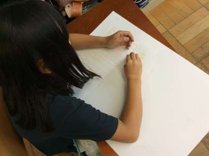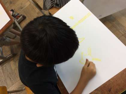 お話を聞いて心に残った場面を絵にします。みんな思い思いにイメージを膨らませてお話の絵の下絵をかいていました。