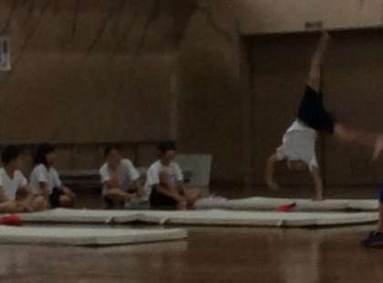 体育ではマット運動に取り組んでいます。しっかりと準備体操をして,自分ができるようになりたい技に挑戦していました。
