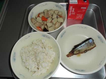 今日の給食は,さんまのしょうがに,こうやどうふとやさいのたきあわせ,むぎごはん,ぎゅうにゅうでした。