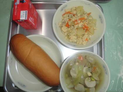 今日の給食は,コッペパン・ソーセージと野菜のスープ煮・かわりいり卵・牛乳でした。