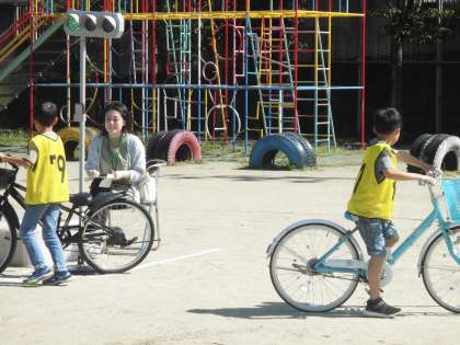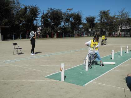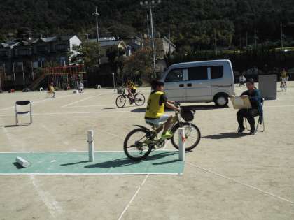 山科警察署の方に来ていただき,4年生が「自転車安全教室」を行いました。実際の街を想定して,信号があったり,路上駐車があったり,見通しの悪い交差点を作ったりして,自転車で走行しました。