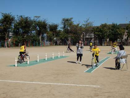 ピンが置かれた道をピンを倒さないように通ったり,細い道をゆっくりと時間をかけて通ったりということにも挑戦しました。ハンドル操作やバランス感覚をとるのがなかなか難しかったようです。安全に自転車に乗るためにも,運転技術も大切なことですね。