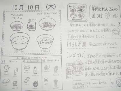 今日の給食は,麦ごはん・すまし汁・大根葉のごまいため・牛肉とれんこんの煮つけ・しばづけです。