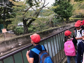 蹴上周辺を散策した後は,山科駅で下車し安祥寺水路橋を見に行きました。琵琶湖疏水の下に川が流れています。琵琶湖疏水の下に川が流れおり,疏水と川が交差するようになっていることに,子ども達はとても驚いていました。「このようなものを発案し,作った昔の人々はすごい!」といろいろな感想をもっていました。