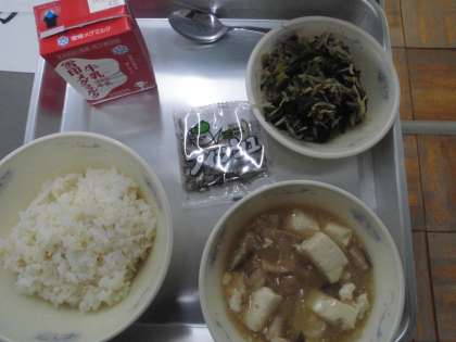 今日の給食は,麦ごはん・豚肉と豆腐のくず煮・ほうれん草ともやしのごま煮・牛乳・じゃこです。