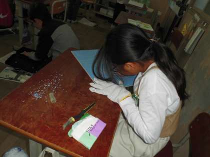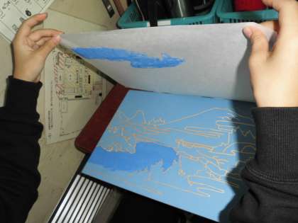 下絵にそって彫っています。彫りが仕上がった人は「刷り」の段階に進みました。