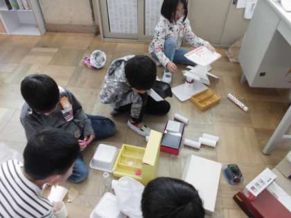 まずは,その場で遊べるおもちゃやゲームを考えてあそびました。1回目より2回目の方がうまく遊べた子も多く,工夫が感じられたようです。