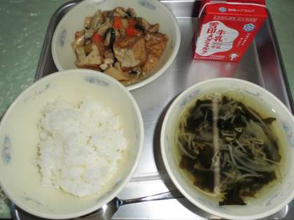 今日の給食は,あつあげのオイスターソースいため・わかめスープ・ごはん・ぎゅうにゅうでした。