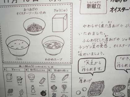 「あつあげのオイスターソースいため」は,新献立です。あつあげの他に,豚肉や野菜もたっぷり,そしてオイスターソースの香りと味・・・,白いご飯にとてもよく合うおかずでした。高学年は,いきおいよくペロリでした。