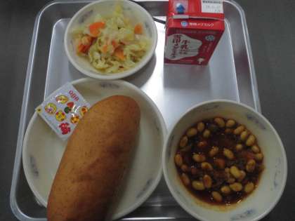 今日の給食は,全粒粉パン・チリコンカーン・カリフラワーのホットマリネ・かたチーズ・牛乳でした。