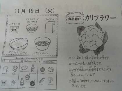 給食カレンダーでは,カリフラワーについて紹介しています。カリフラワーは,冬に旬を迎える野菜で,これからが食べ頃です。