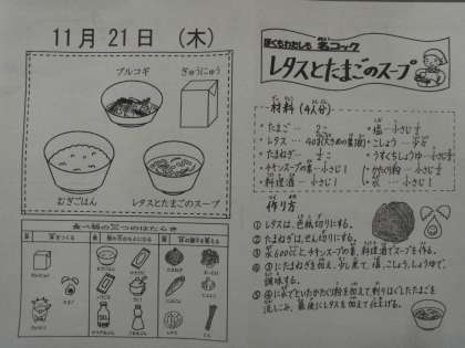 給食カレンダーでは,レタスと玉子のスープのレシピを紹介しています。シャキシャキしたレタスの触感をお家でも,スープにして味わってみてください。