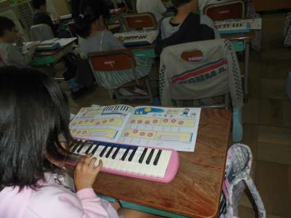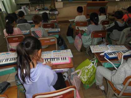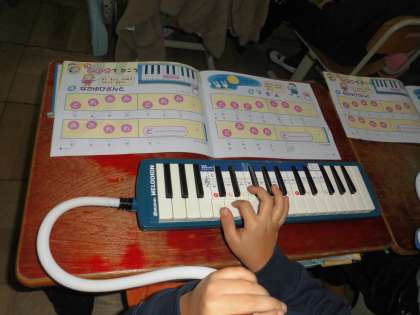 この曲は,同じ音が続くところがあります。そこは,指で何回も押さえずに,けんばんを押さえたまま,「トゥ・トゥ」と口で音を切ります。ちょっとむずかしい・・・。