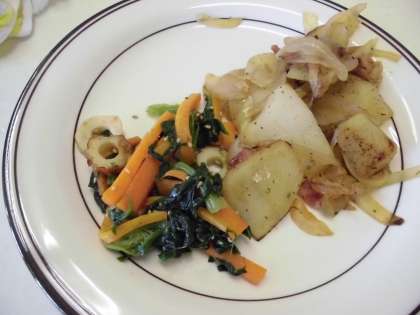 「ジャーマンポテト」「青菜とちくわとにんじんのごま風味」完成です!