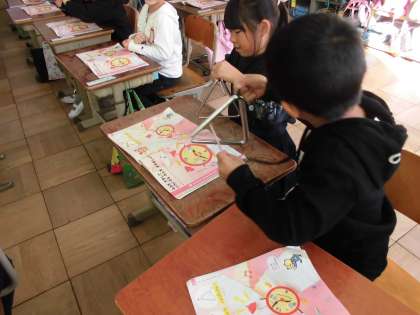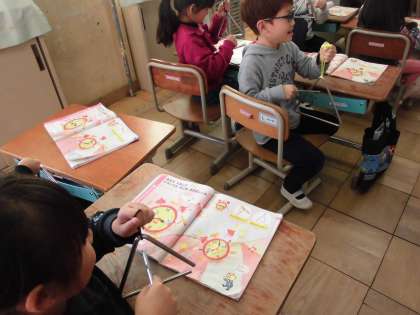 「シンコペーテッドクロック」の曲にのって,打楽器を合わせます。