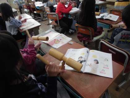 まず,ウッドブロックチームが,テンポよく「カッ,コッ,カッ,コッ」とリズムをきざみます。