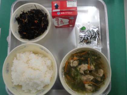 今日の給食は,ごはん・水菜とつみれのはりはり鍋・ひじきの煮つけ・牛乳・じゃこです。