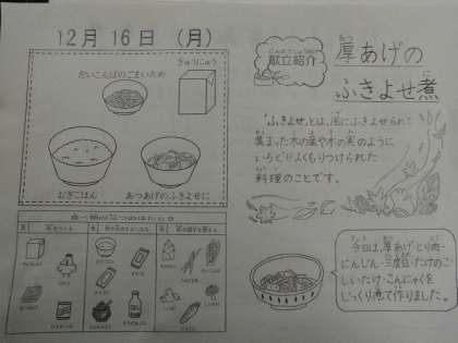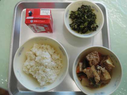 今日の給食は,麦ごはん・厚揚げのふきよせ煮・大根葉のごま炒め・牛乳です。