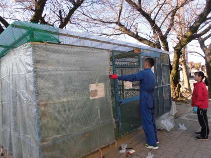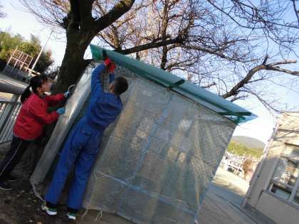 校長先生と管理用務員さんが,飼育小屋の屋根じまいと外囲いをして,冬支度を整えてくださいました。