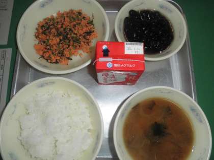 今日の給食は,ごはん・みそ汁・鮭と大根葉のまぜごはんの具・黒豆・牛乳です。