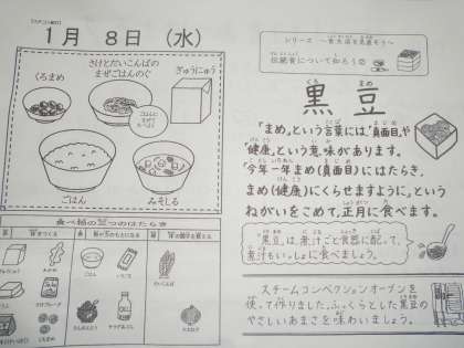 お正月料理にも使われる「黒豆」は,1年間,まじめに健康で過ごせるように・・・。と言う,願いを込めて食べます。