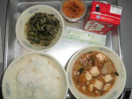 今日の給食は,ごはん・豆腐の四川風・ほうれん草ともやしの炒めナムル・牛乳・プリンです。