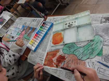 まだ彫っている人もいますが,ほとんどの人が「彫り」を終え,「刷り」と「彩色」の段階に進みました。