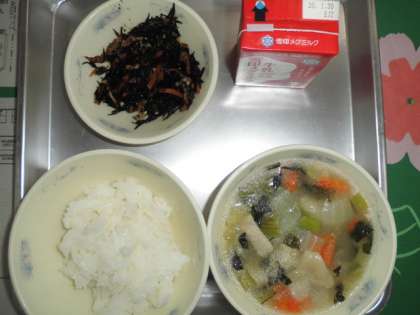 今日の給食は,ごはん・すいとん鍋・ひじきの煮つけ・牛乳です。