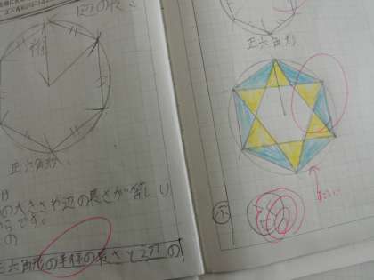 今日は,正六角形の特質を使って,授業の最後に「もよう作り」をしました。