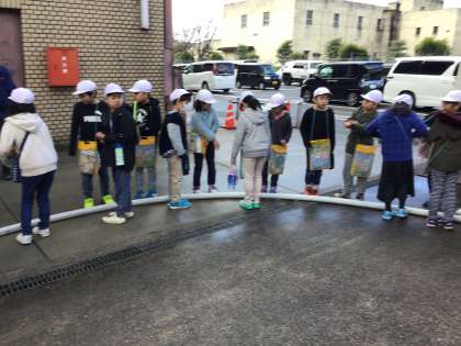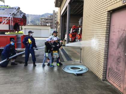 ホースの中に水が入っている状態と入っていない状態とでは重さが違うことを体験させてもらったり,実際に放水体験をさせてもらったりと貴重な時間を過ごすことができました。