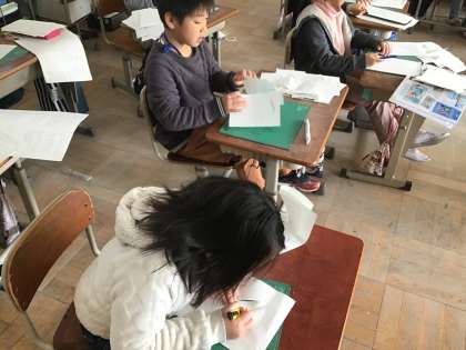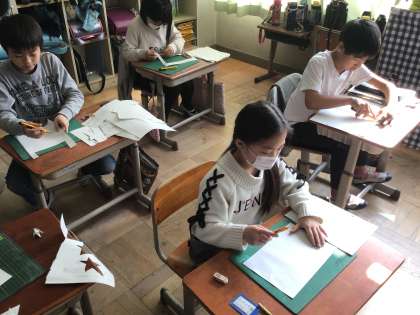 カッターナイフを使って紙に窓を作り,できた窓から見えるものを想像して作品にします。今日はどんな窓にしようか,どんな切り方にすればいいのかを試行錯誤しながらも楽しんで学習していました。