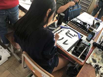 書写で「ビル」という字を書きました。初めてのカタカナで折れの部分やはらう部分に苦戦していましたが,みんなポイントを意識した力強い作品を完成させていました。
