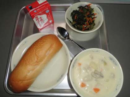 今日の給食は,味付けコッペパン・じゃがいものクリームシチュー・小松菜のソテー・牛乳でした。