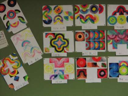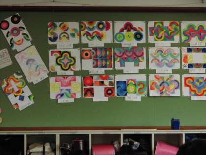 色作りの工夫,パターンの工夫,組合せの工夫・・・と,いろいろな工夫を重ねて,「ふしぎなもよう」ができあがりました。
