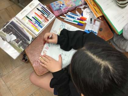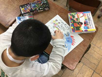 ぽかぽか交流に向けて校内ウォークラリーの際に使うカードを作成しています。年長さんが喜ぶようにどんな絵を描いたらいいのか考えながらカラフルに色を塗って取り組んでいました。