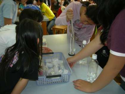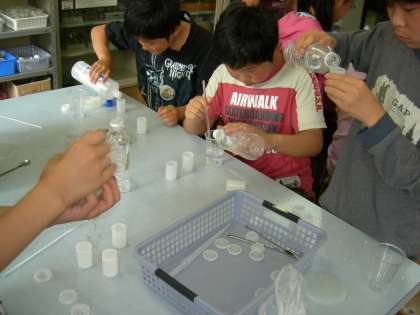 スライム作りに使うホウ砂の溶けているのはどちらか,100ccの水の重さを比べるのですが,重い方が水溶液で,全班正解しました。