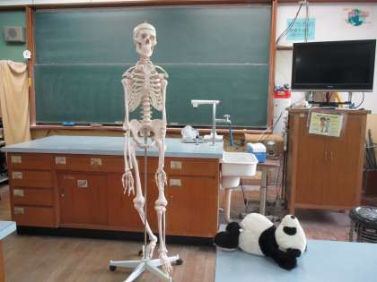 「ごめんよ。おどろかせて。ぼくはじんたいもけいの「がい こつお」です。ここはりかしつだよ。りかのじっけんやかんさつをするところだよ。」