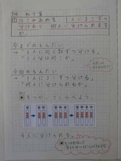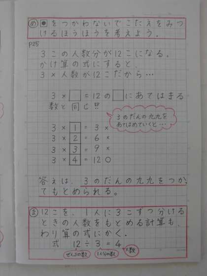 3この人数分が12こ・・・3×□=12・・・3のだんにあてはめると・・・